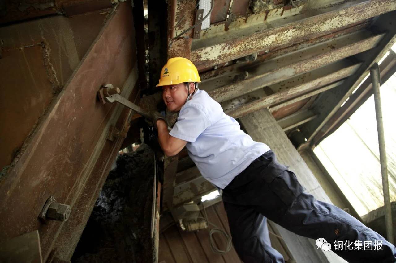 下了皮帶廊,走到主井礦倉(cāng)下,老郭自豪地指著頭頂上方:“8個(gè)漏斗,過(guò)去維修和更換都是委外,現(xiàn)在都是我?guī)俗约焊伞《嗌馘X我不曉得,自己的事情就該自己干,能省一個(gè)是一個(gè)!”說(shuō)到興奮時(shí),他還掏出手機(jī)上圖片給我講2個(gè)月前他們打的一場(chǎng)硬仗:主井35米礦倉(cāng)漏斗因礦石提運(yùn)沖擊導(dǎo)致四邊混凝土嚴(yán)重磨損,礦業(yè)公司聽(tīng)取老郭的建議,準(zhǔn)備為漏斗四邊安裝4塊鋼板以保護(hù)受損的混凝土墻體。為了最大限度減少對(duì)主井出礦的影響,只給他們48小時(shí)的停產(chǎn)時(shí)間。頭一次接這大活的老郭也沒(méi)犯怵,提前準(zhǔn)備好鋼板、木條等材料,將8名維修工分成3班,白班和小夜班清漏斗、制作安裝安全護(hù)板、鑲嵌鋼板,大夜班專門焊接鋼板??辛?天的方便面,提前2小時(shí)完工將漏斗交付使用……